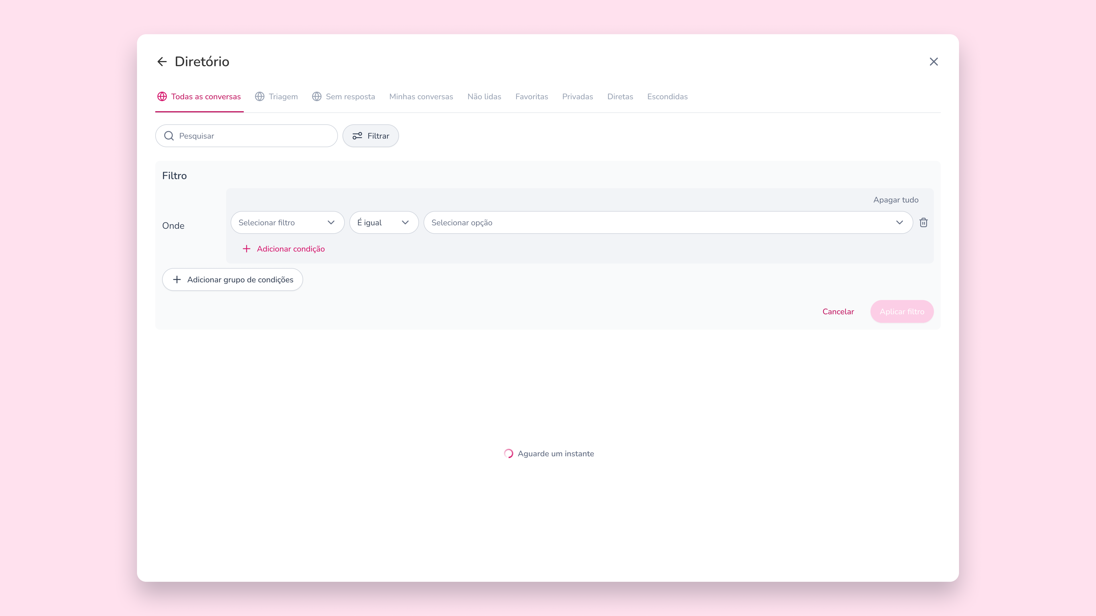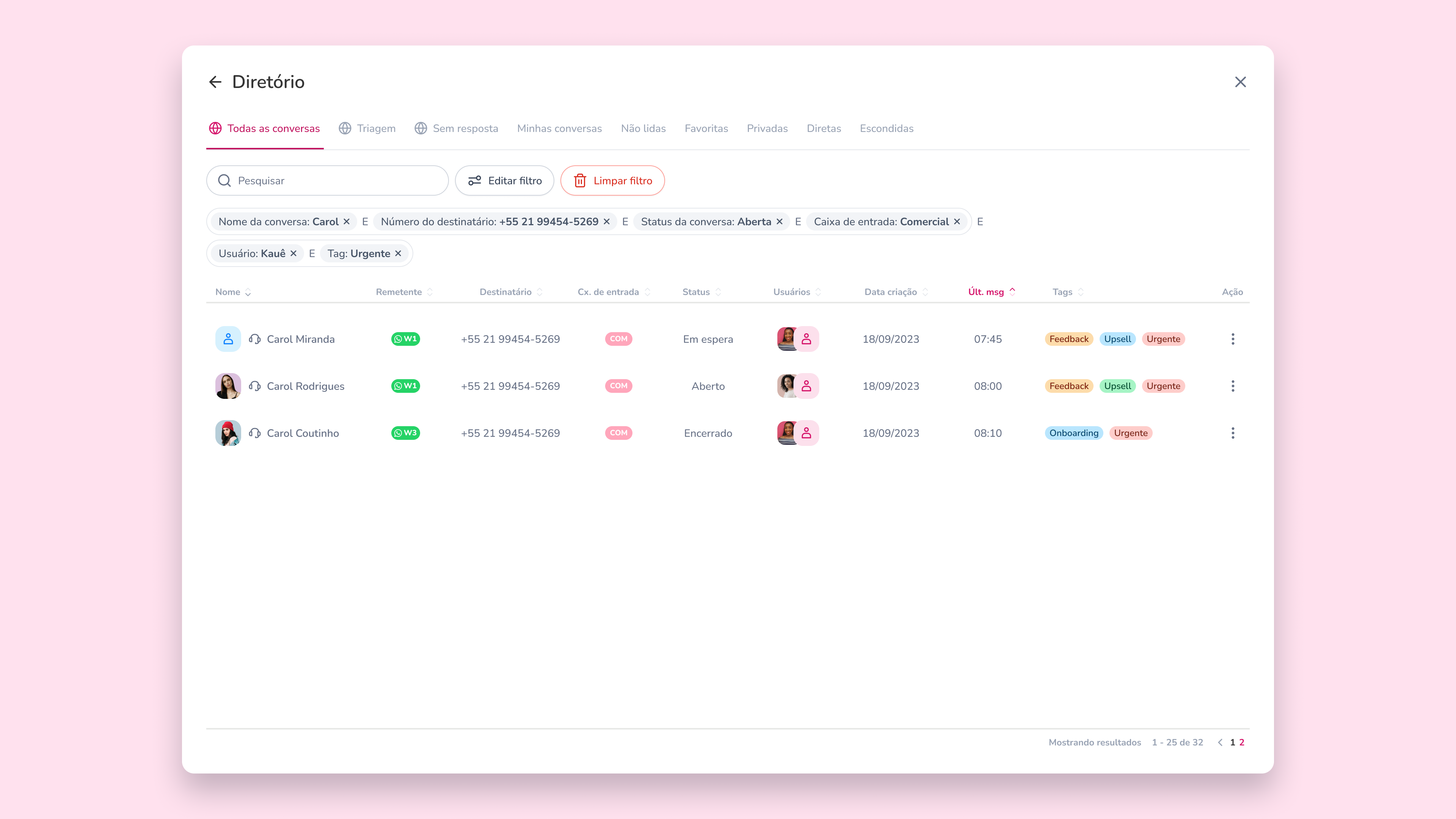 Encontrar uma conversa específica em meio a muitos atendimentos pode tomar tempo e gerar retrabalho. Pensando nisso, a Pink lançou os filtros avançados no Diretório, uma melhoria criada para ajudar qualquer usuário a localizar atendimentos com muito mais precisão.