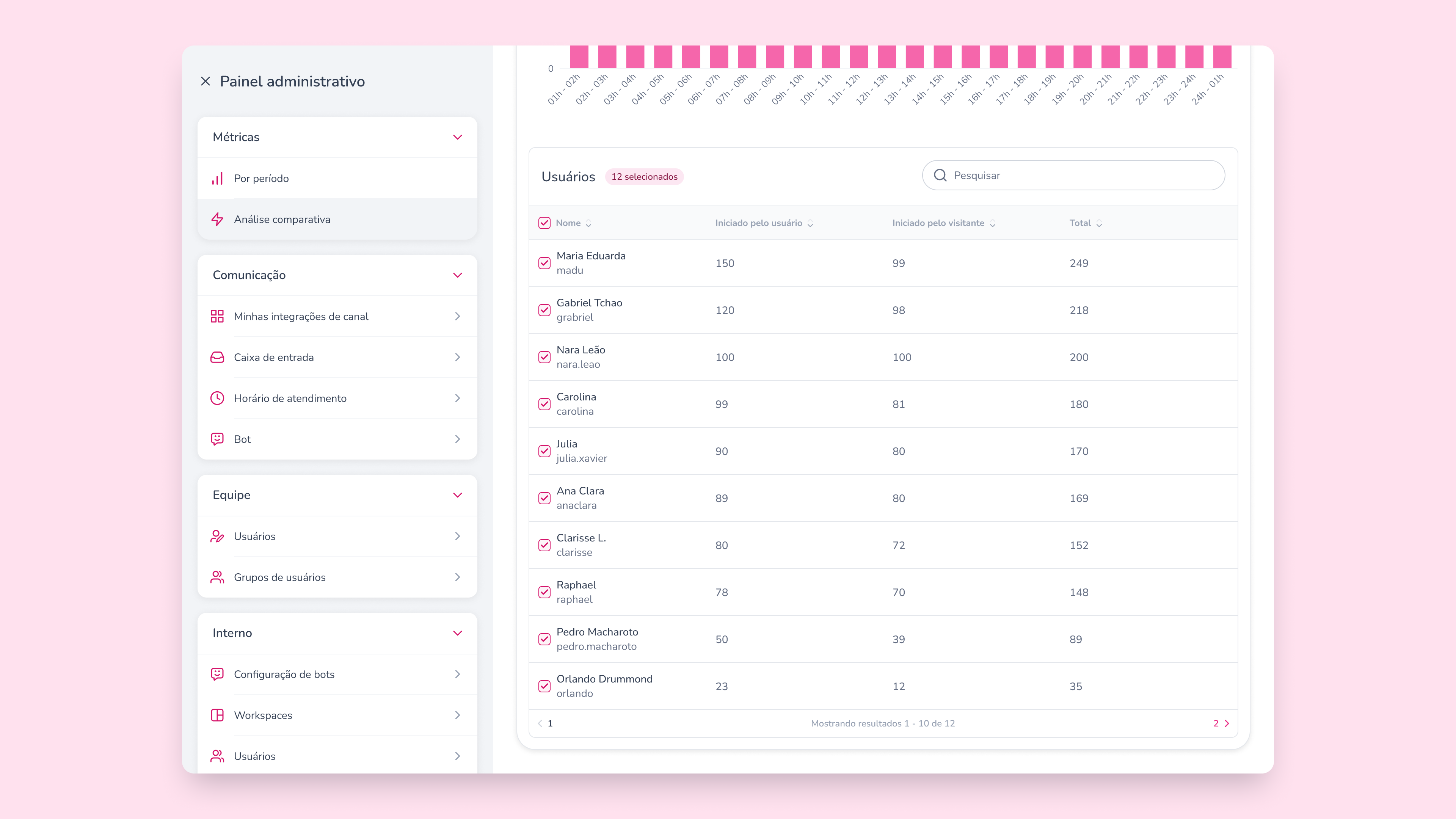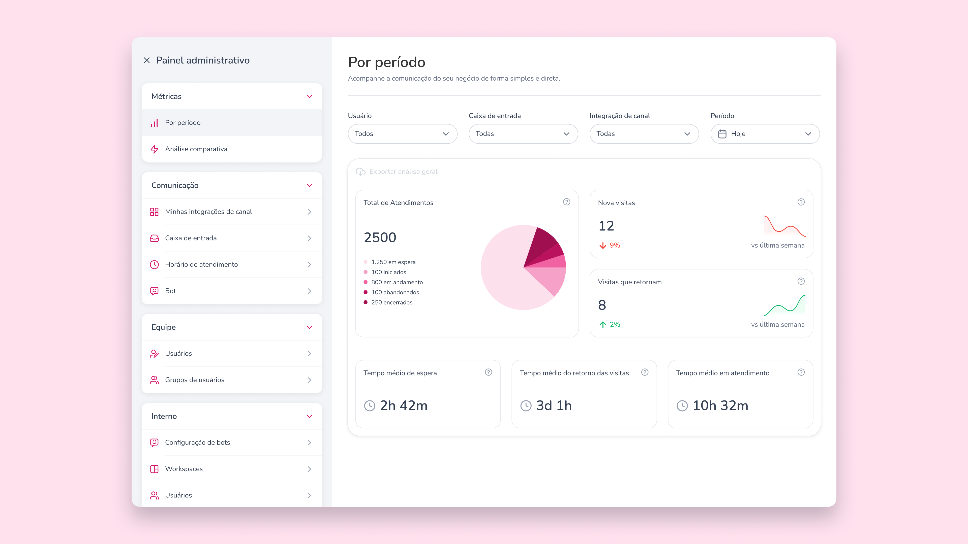Pensando nisso, a Pink lançou um novo painel de métricas no área administrativa, desenvolvido especialmente para gestores e gerentes que precisam de uma visão clara e confiável da operação de atendimento.